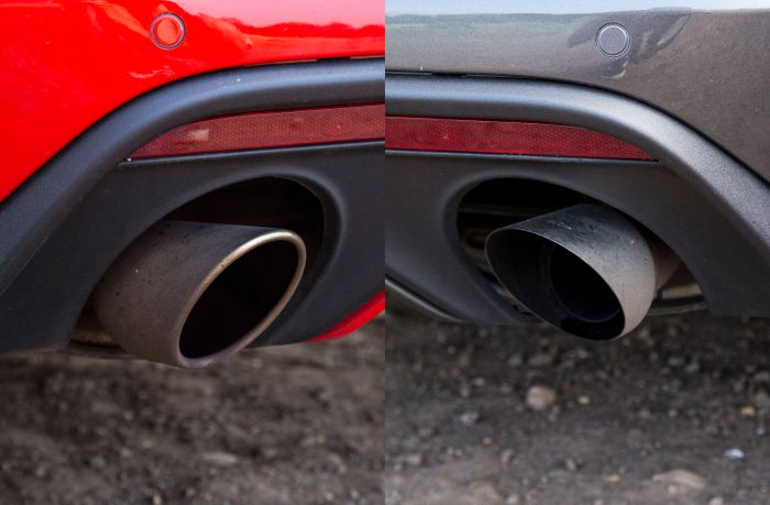 Тук разликите са едва доловими, но не и за големите фенове на Mustang. Еcooboost версията вдясно включва фалшив накрайник с много по-тънки и остри ръбове отколкото изходящата тръба на V8.