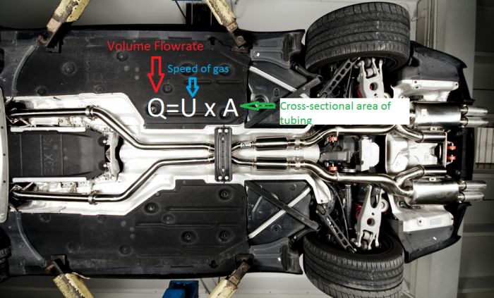 Размерите на изпускателната система обикновено следват теорията на Обемния дебит. Това е количеството газ, което може да бъде извлечено от системата в даден момент. То е в директна връзка с изпускателната система. Изчислява се като се умножи напречното сечение на тръбата по скоростта на газа преминаващ през нея: