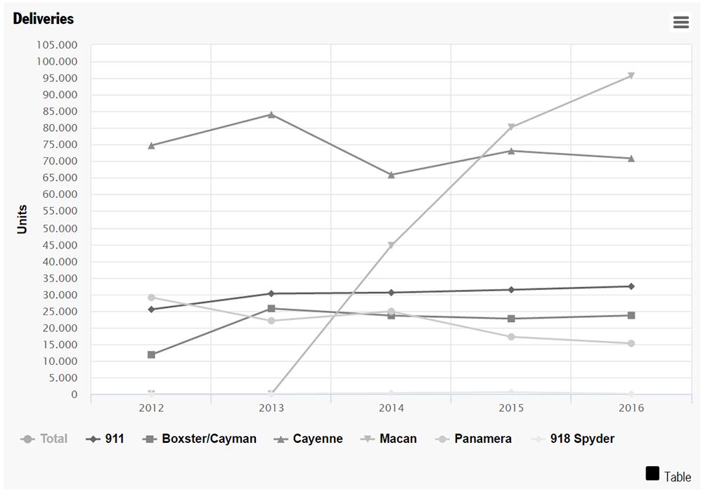 Тези цифри сами по себе си са доста забележителни, а големите продажби са резултат от успешния модел Macan. През 2013 година, последната пълна година преди пускането на модела, Cayenne също се е продавал повече от всички други модели взети заедно, но с разлика от едва няколко хиляди. През 2016 година, продажбите на Cayeene падат с 10,000 спрямо 2013 година, но Macan става много популярен автомобил с продажби от над 95,000 за година.